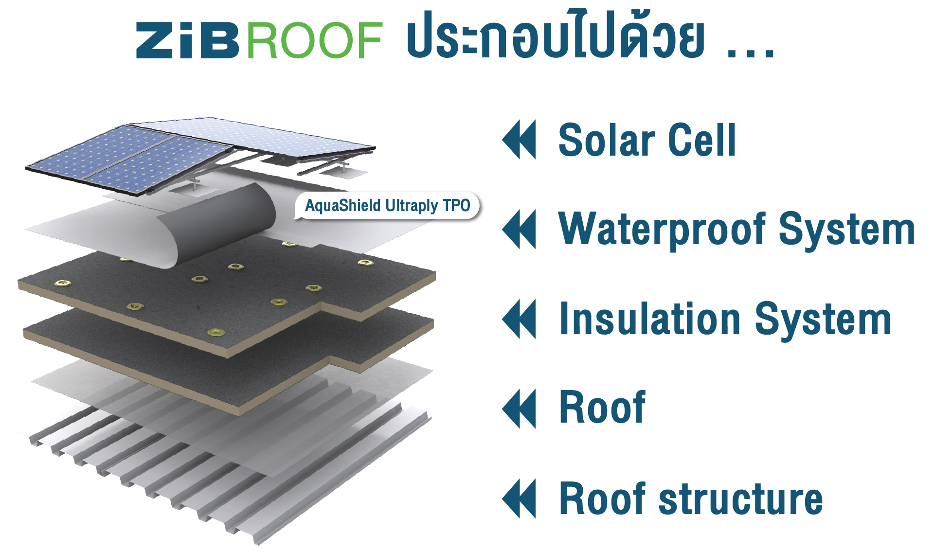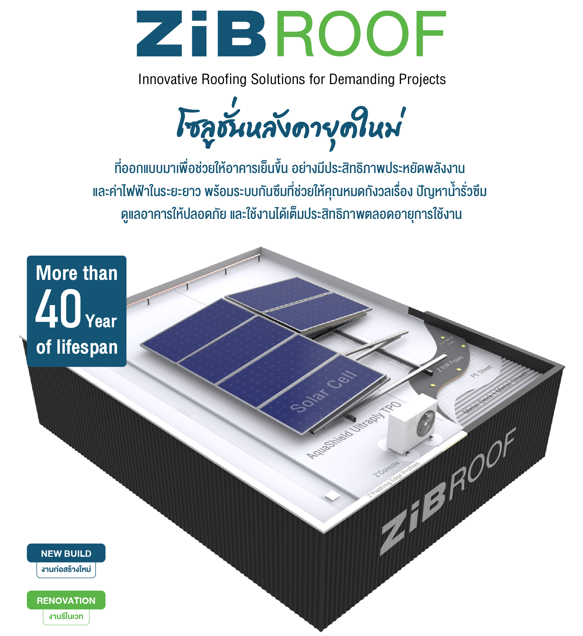 ปิดผิวด้วยแผ่นเมทัลชีทคุณภาพสูง และระบบกันซึมคุณภาพสูง AquaShield Ultraply TPO ที่มีความยืดหยุ่น ทนรังสี UV