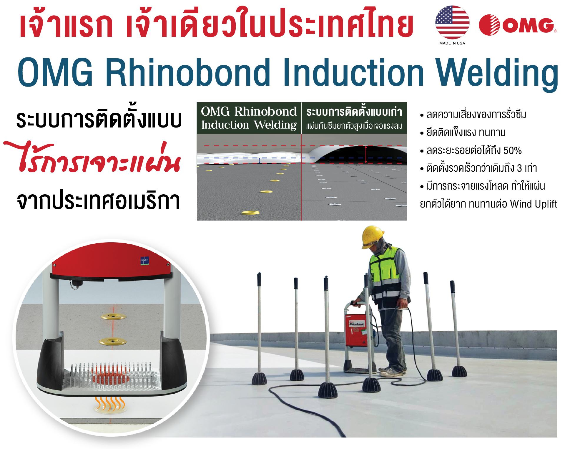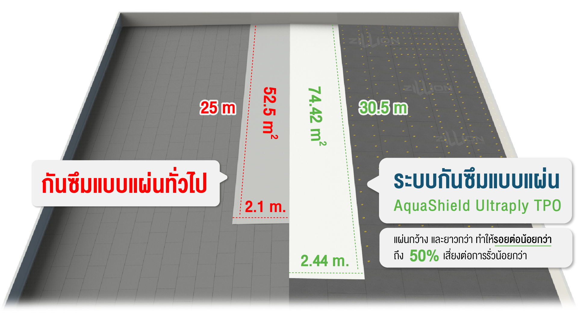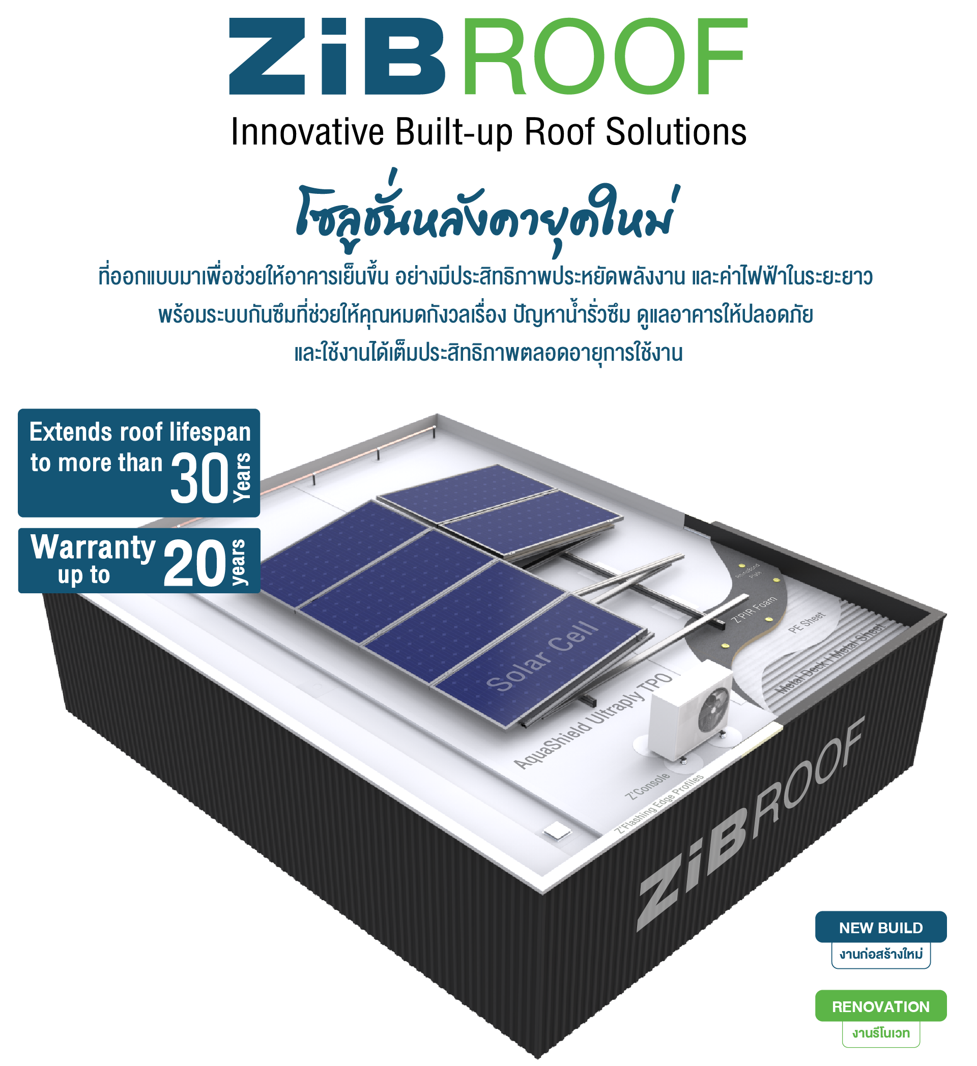 ปิดผิวด้วยแผ่นเมทัลชีทคุณภาพสูง และระบบกันซึมคุณภาพสูง AquaShield Ultraply TPO ที่มีความยืดหยุ่น ทนรังสี UV