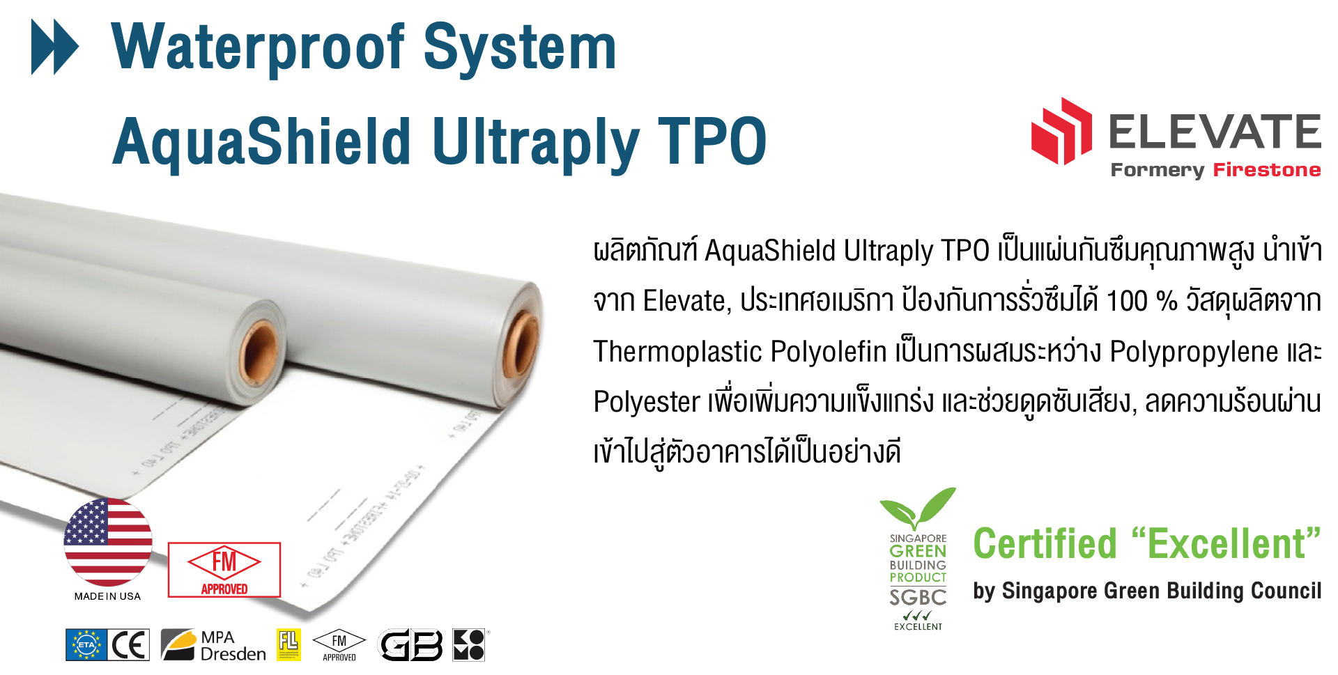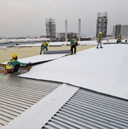 เมมเบรนกันซึมหลังคาชนิด TPO (Thermoplastic Polyolefin) ที่่มีความยืดหยุ่น เหนียว และทนทาน มีคุณสมบัติสะท้อนความร้อนและประหยัดพลังงาน พื้นผิวสีอ่อนของแผ่นจะสะท้อนแสงอาทิตย์ ก่อนที่จะถูกดูดซับ และเปลี่ยนเป็นความร้อน ซึ่งช่วยลดค่าไฟจากการทำงานของเครื่องปรับอากาศ วัสดุเป็นมิตรต่อสิ่งแวดล้อม Eco-friendly membrane และสามารถ Recycled ได้ง่ายอีกด้วย